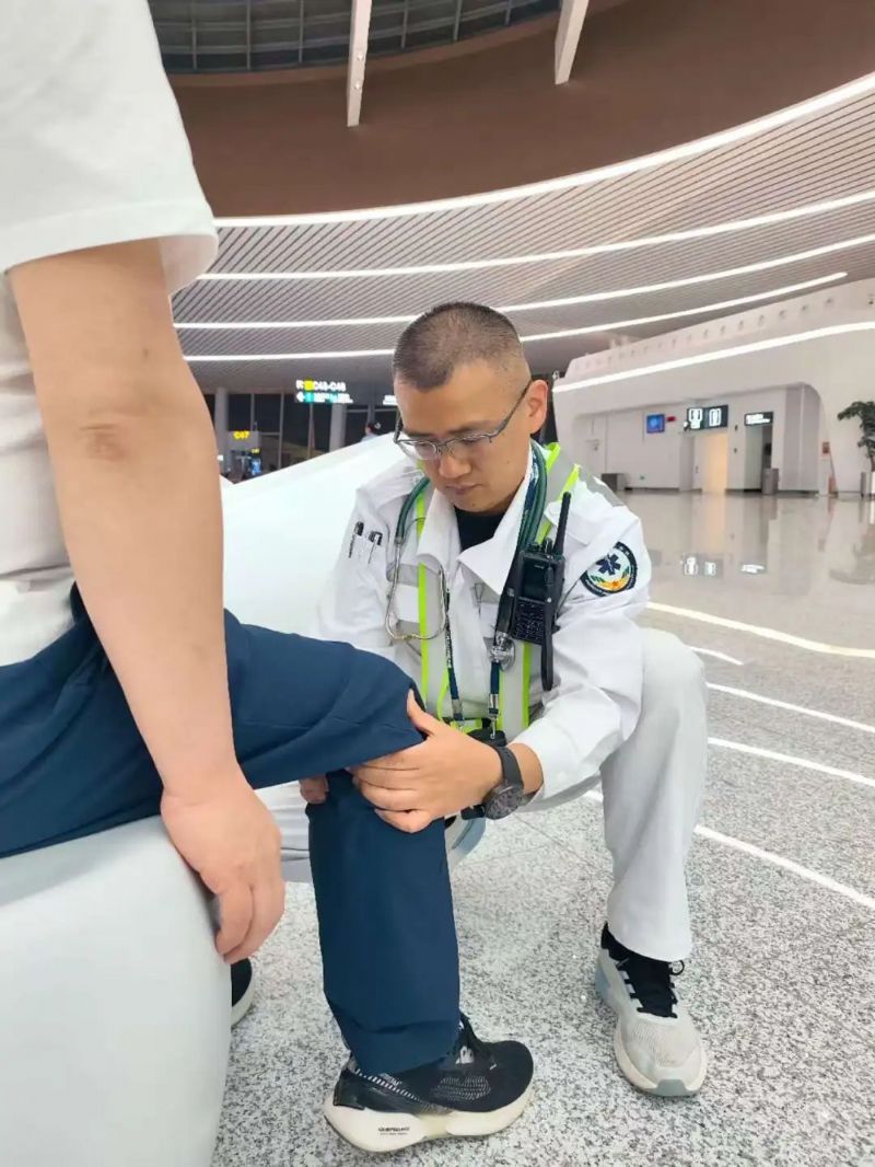 在狭窄的机舱内,他毫不犹豫地为紧急分娩中因羊水窒息的新生儿吸出呛入物;在航站楼,他跪地实施心肺复苏,长达半小时的持续奋战中,双臂虽因反复按压而颤抖不已,但他凭借顽强的意志,与死神较量,最终成功挽救了心跳骤停两次的患者。面对患者的焦急与病痛,他俯身倾听患者的细微诉求,耐心安抚紧急处置后惊魂未定的家属;用通俗易懂的语言讲解病情,为特殊病患定制专属急救方案,以春风化雨般的温暖,将“真情服务”融入救治全过程。