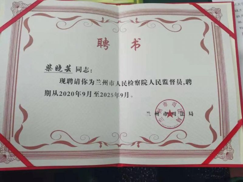 近日,农工党兰州市西固区基层委副主委柴晓芸被兰州市司法局聘请为兰州市人民检察院人民监督员,聘期五年。