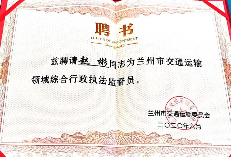 农工党员赵彬被聘为兰州市交通运输领域综合行政执法监督员