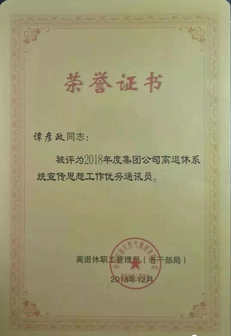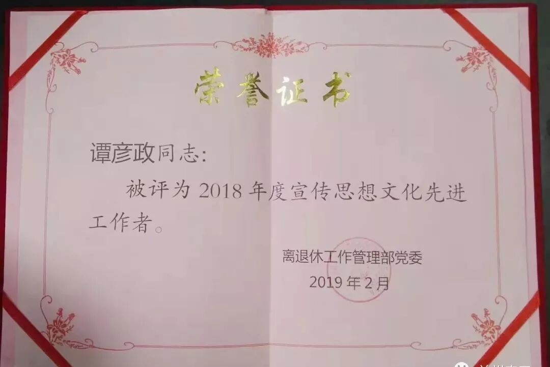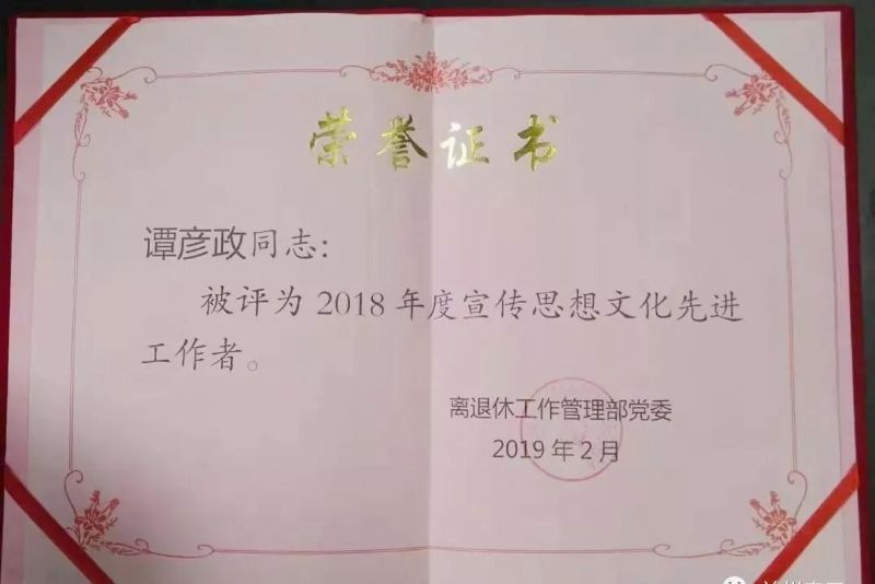 2019年2月27日,兰州石化离退休工作管理部召开宣传思想政治工作会议,农工党兰州市西固区基层委党员谭彦政,被评为兰州石化离退休工作管理部宣传思想文化先进工作者。