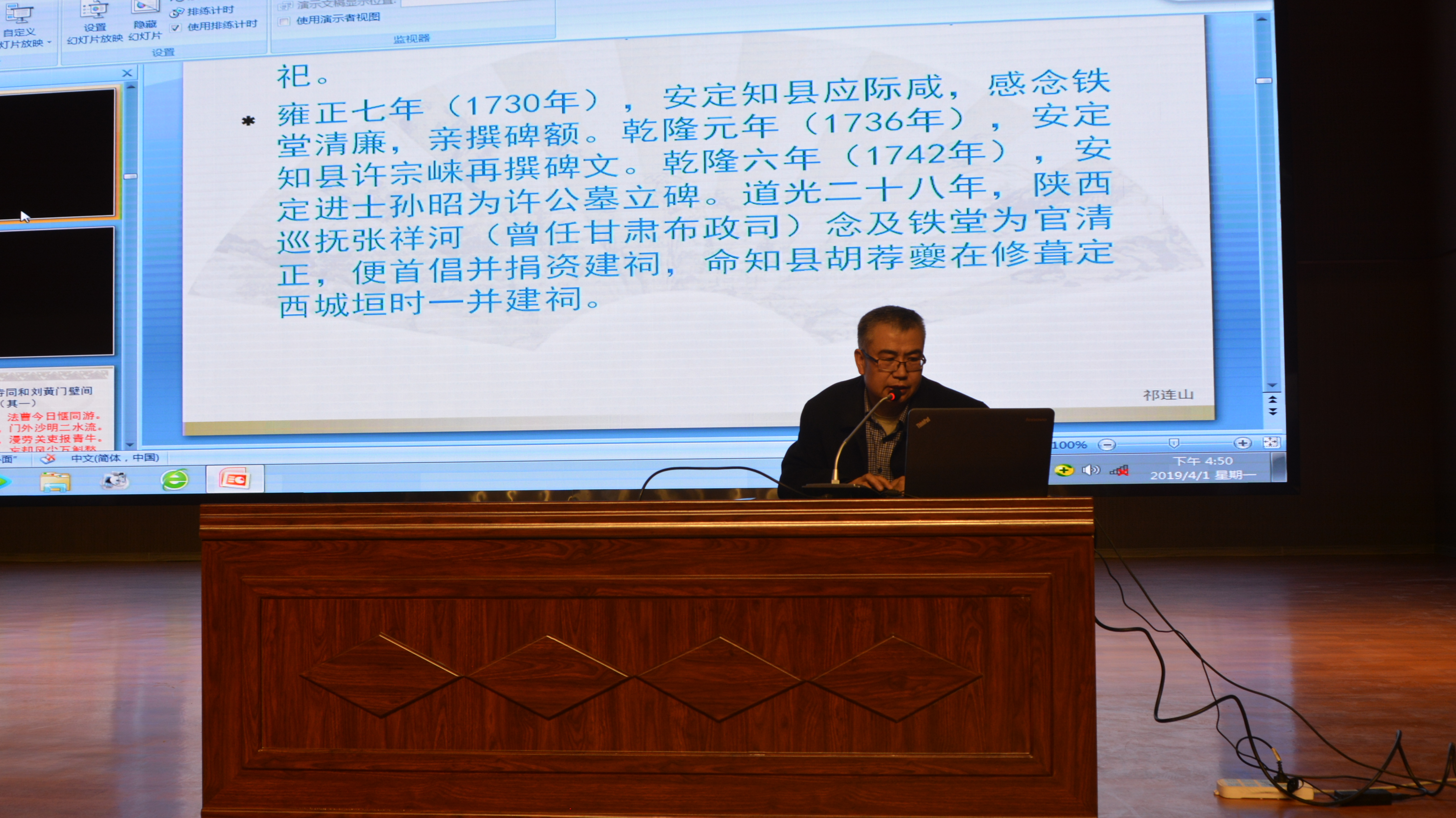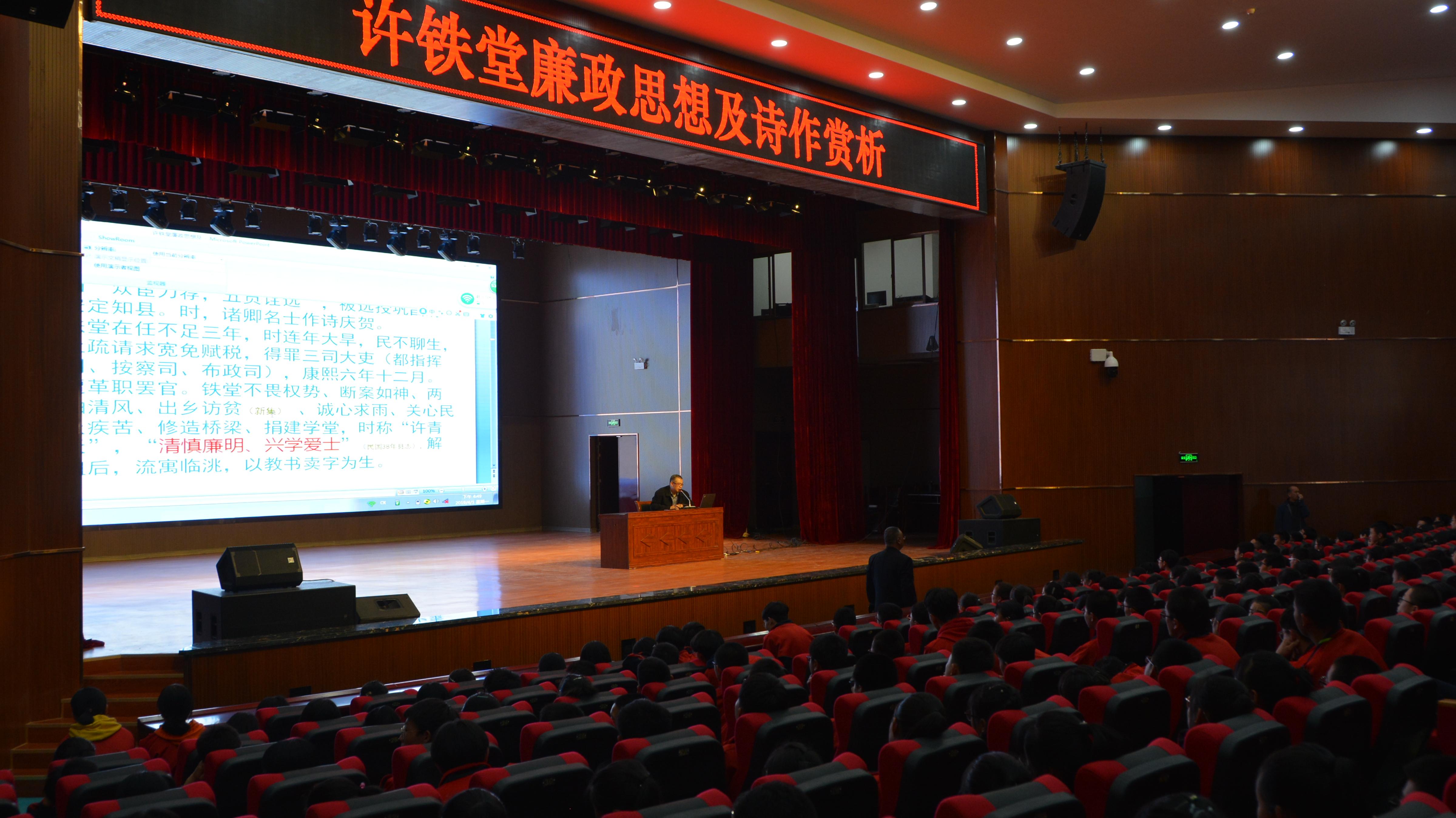 2019年4月1日,由农工党安定区总支党员刘阳河主讲的学校传承文化类校本课程——《许铁堂廉政思想及诗作赏析》在东方红中学礼堂首次精彩展现。学校部分领导、教师、高一级全体学生进行了观摩。
