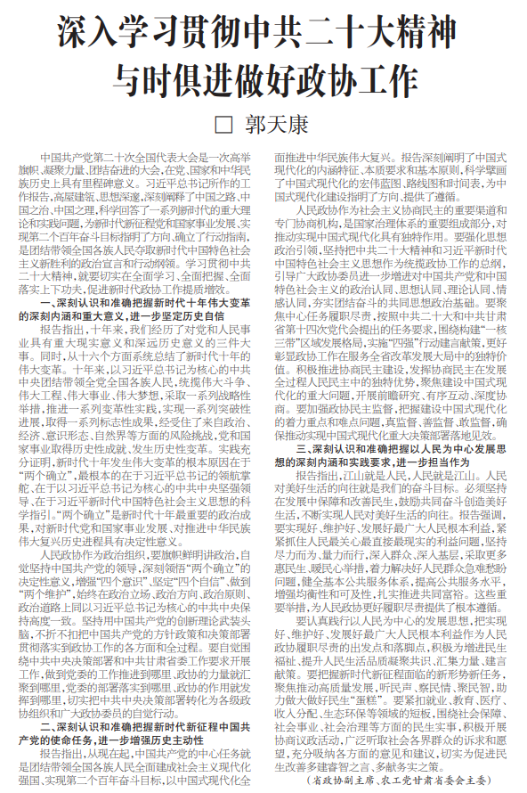 深入学习贯彻中共二十大精神 与时俱进做好政协工作